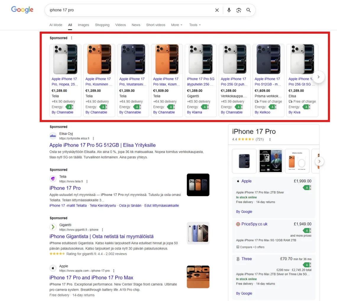 - Näide (Iphone 17 shopping reklaamid Soomes):