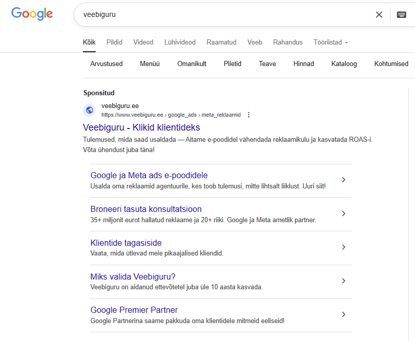 Kõige klassikalisem ja siiani üks tulemuslikumaid Google Ads formaate. Reklaamid kuvatakse siis, kui inimene otsib aktiivselt toodet või teenust.